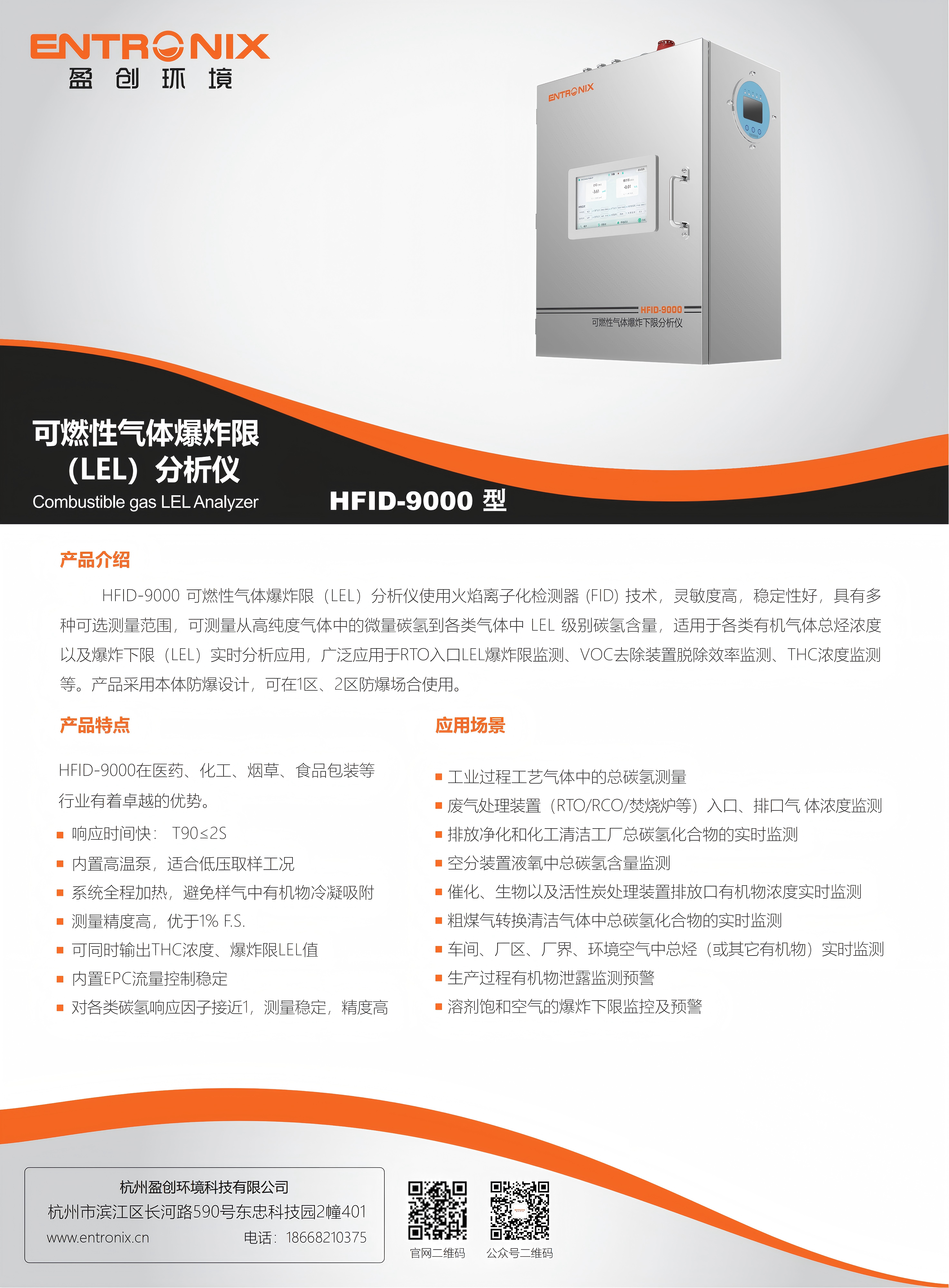 HFID-9000 可燃性气体爆炸限(LEL)分析仪使用火焰离子化检测器 (FID) 技术,灵敏度高,稳定性好,具有多 种可选测量范围,可测量从高纯度气体中的微量碳氢到各类气体中 LEL 级别碳氢含量,适用于各类有机气体总烃浓度 以及爆炸下限(LEL)实时分析应用,广泛应用于RTO入口LEL爆炸限监测、VOC去除装置脱除效率监测、THC浓度监测 等。产品采用本体防爆设计,可在1区、2区防爆场合使用。